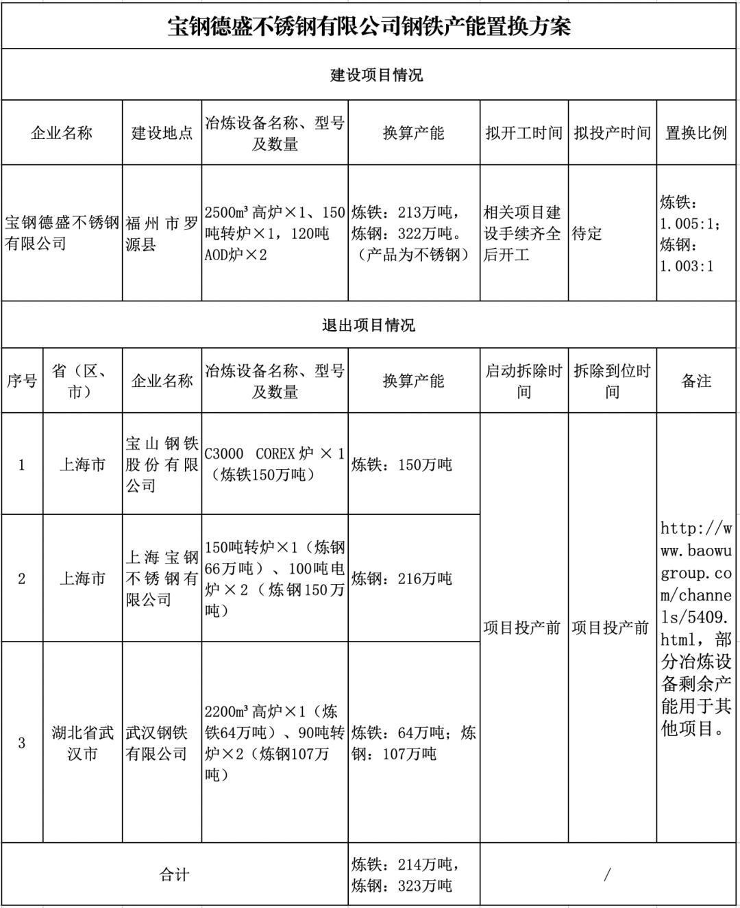 2019年11月16日,梧州市政府与河北迁安市九江公司举行项目签约仪式,双方携手共同推进千万吨冶金新材料(钢铁)基地加快建设。宝钢湛江钢铁三高炉系统项目,炼铁产能403万吨,炼钢产能361万吨。以上产能来自于宝武内部宝钢不锈钢,梅钢部分产能关停的置换。17