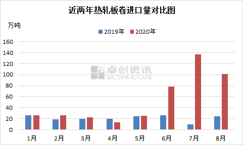 从2020年5月份开始,热轧板卷进口量逐步出现增加迹象,到8月份,热轧板卷总进口量在101.275万吨,同比2019年同期增加325%,2020年1-8月,热轧板卷总进口量为428.6万吨,已经远远超过2019年全年的进口量,2019年全年热轧板卷进口量为295万吨。无论是产量还是库存或者是进口,热轧板卷供应方面基本保持在一个偏高的水平。