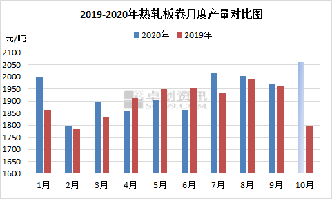 2020年热轧板卷持续处于高产量、高库存的背景之中,9月份热轧板卷总产量为1969.52万吨,同比去年同期增加0.43%,而到10月份,随着乐亭钢厂的达产以及重庆地区攀华集团的投产,热轧板卷产量仍有继续上升的可能,卓创资讯预计到10月份,热轧板卷总产量或将超过2000万吨,达到产量上限预警线。