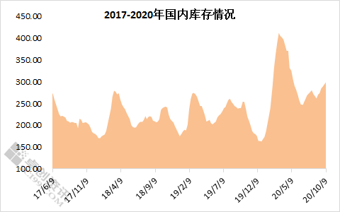 在国庆节假期期间,贸易商到货相对顺畅,但出货情况较为一般,因此热轧板卷社会库存多有累积,据卓创资讯监测全国热轧板卷社会库存情况,截止本周五,热卷社会库存总量在300万吨左右,较节前累计增加11万吨吨,高库存再次施压。
